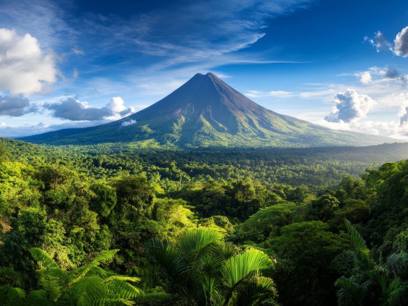 - La végétation tropicale et luxuriante du Parc National du volcan Arenal dominé par son colossal volcan