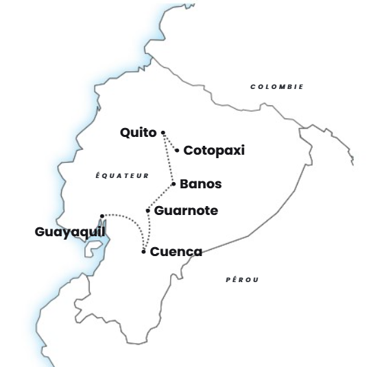 Les transferts aéroport / hôtel et centre-ville / station de location de voiture le jour 1 - 8 nuits dans les hôtels cités ou similaires, selon l’option choisie - 8 petits déjeuners - La visite de Quito le jour 1 en service privé avec guide francophone - 7 jours de location de voiture de catégorie O1 Suv 4x2 de type Suzuki Grand Vitara (ou similaire) en kilométrage illimité, assurance au tiers et GPS inclus - Les frais d’abandon à Guayaquil.