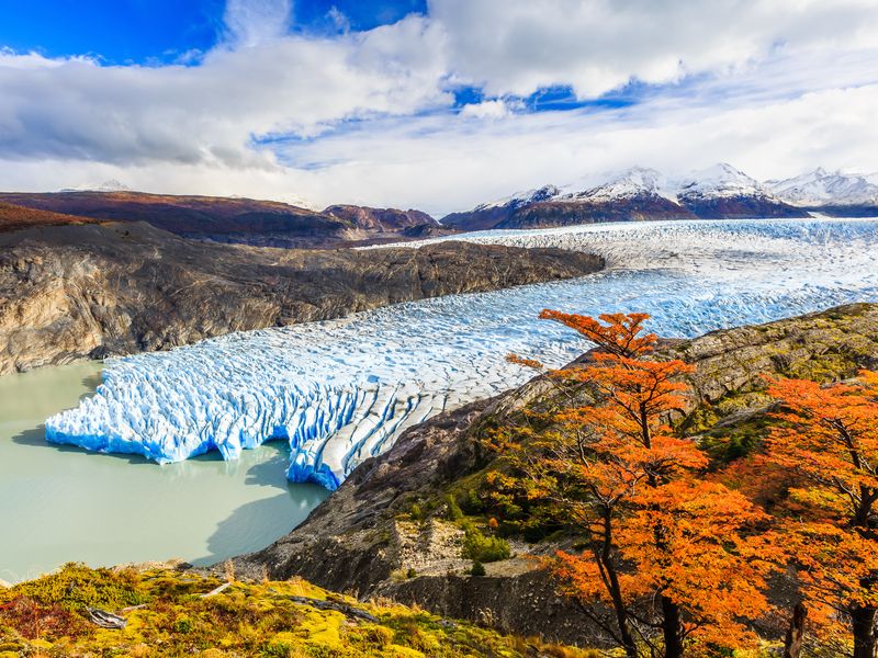 Arrêt à la grotte du fameux Milodon, un herbivore préhistorique datant de 12 000 ans puis route vers le magnifique parc national Torres del Paine, certainement l’un des plus beaux du Chili avec ses paysages de glaciers, lacs, cascades et gigantesques forêts où vivent des guanacos, condors, renards, autruches, aigles… Au lac Grey, promenade sur la plage où les icebergs viennent s’échouer.