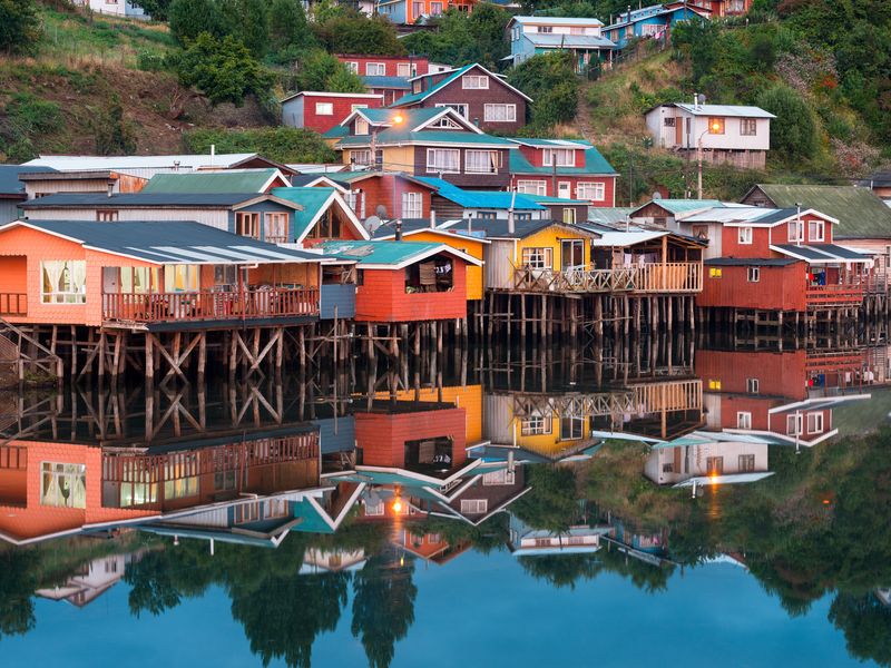Ce matin, vous empruntez le ferry pour rallier l’île de Chiloé en traversant le canal de Chacao. Découverte de cette île, terre de légendes indiennes, avec ses étranges habitations sur pilotis et ses églises en bois, dont certaines sont classées par l’UNESCO. Visite de la ville d’Ancud avec ses ruelles bordées de maisons colorées et du fort San Antonio.