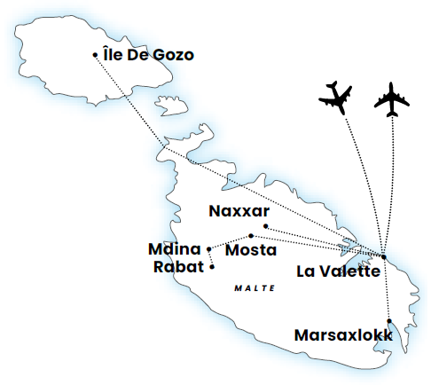 - Le transport aérien France / Malte / France sur compagnie régulière (vols avec ou sans escale et changement d’appareil), taxes incluses