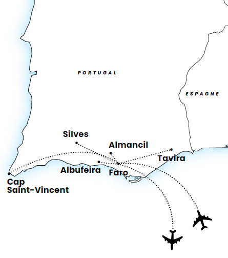 Prise en charge de votre région ou de votre domicile et transfert vers l’aéroport (en option). Envol vers le Portugal et Faro. Accueil et transfert à votre hôtel.