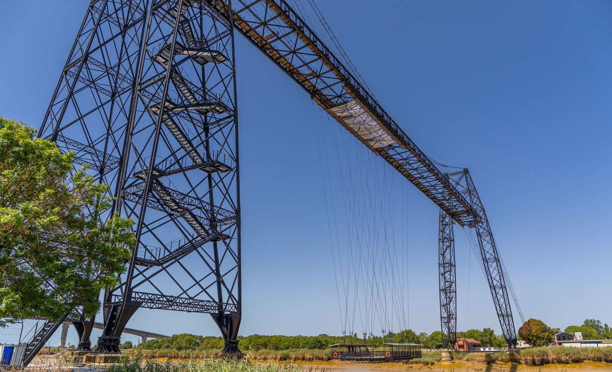 Franchissement de fleuve Charente à bord de la nacelle du « pont transpordeur », exceptionnel ouvrage d’art, unique en France, dernier témoin de ce type d’architecture.
